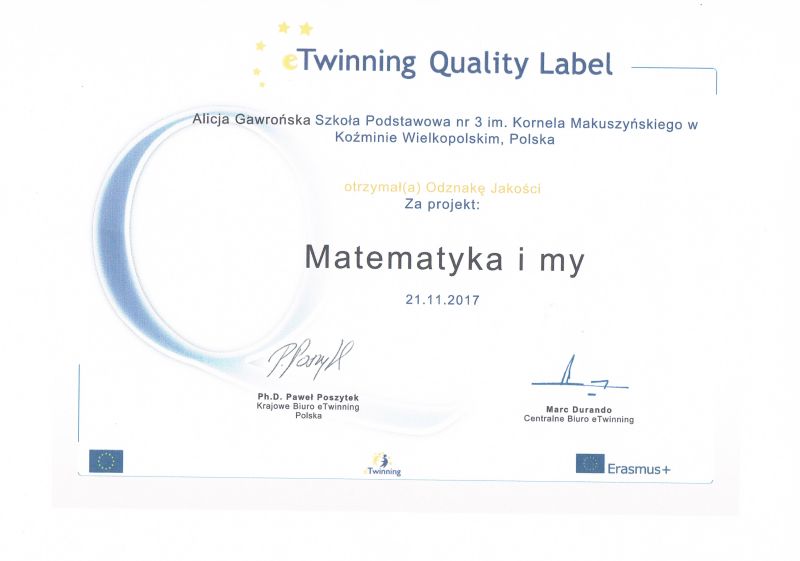 Projekt "Matematyka i my", który był realizowany przez Alicję Gawrońską ze Szkoły Podstawowej nr 3
