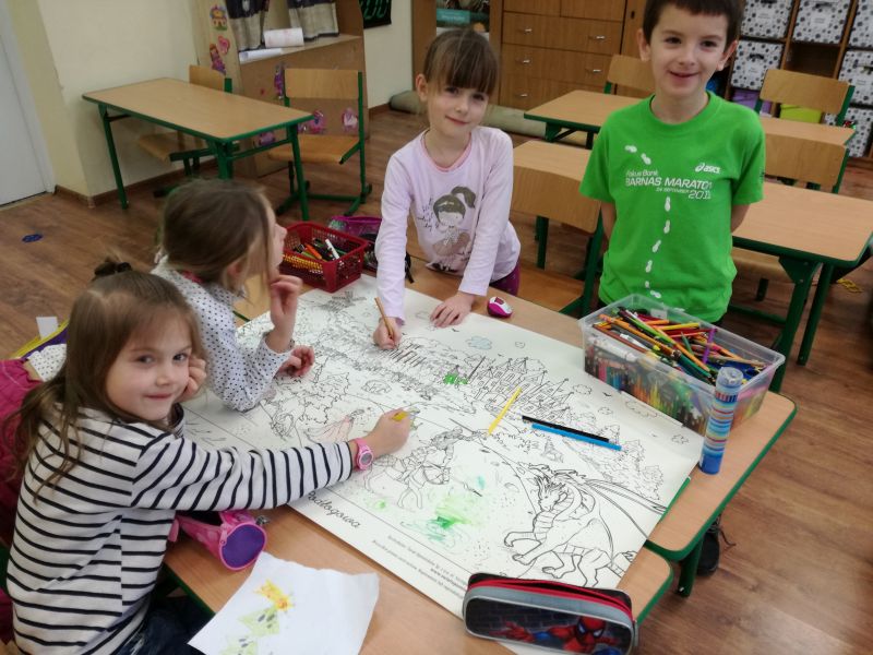 Wtorek był niezwykłym dniem. Dziewczynki z klasy IV a Justyna Wojtkowiak i Oliwia Garkowska czytały swoim młodszym kolegom i koleżankom niezapomniane wiersze Juliana Tuwima, Jana Brzechwy, Wandy Chotomskiej oraz bajki Disneya. Wszyscy słuchali z wielkim zainteresowaniem. Przepojone humorem, radością wiersze bardzo przypadły do gustu uczestnikom świetlicy. Swoje wrażenia przedstawili w pięknych pracach plastycznych. Poza tym dyskusje o ulubionych bajkach trwały do samego końca zajęć.