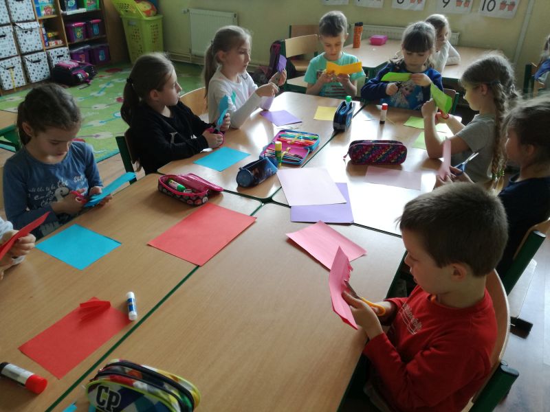 Na zajęciach plastycznych w świetlicy szkolnej oraz świetlicy tematycznej rozpoczęliśmy przygodę z origami. Dzieci dzięki origami rozwijają swoje zainteresowania, doskonalą sprawność manualną, pobudzają swoją wyobraźnię. Origami daje dzieciom dużo zadowolenia, satysfakcji i poczucia szybkiego osiągania sukcesu. Cudowne prace, bardzo kolorowe można podziwiać na szkolnym korytarzu.