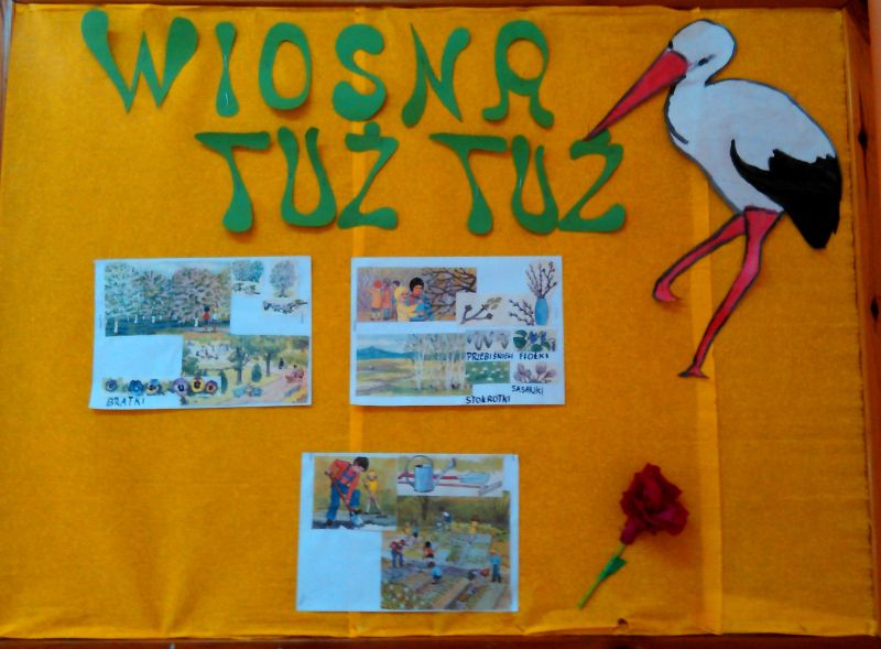 W tym roku Pani wiosna się nie spóźniła, punktualnie zapukała do drzwi naszej szkolnej świetlicy. Weszła w blasku promieni słonecznych, które sprawiły, iż na twarzach dzieci pojawił się wiosenny uśmiech. Pojawiły się kolorowe wiosenne kwiaty namalowane przez dzieci oraz piękne, bociany.