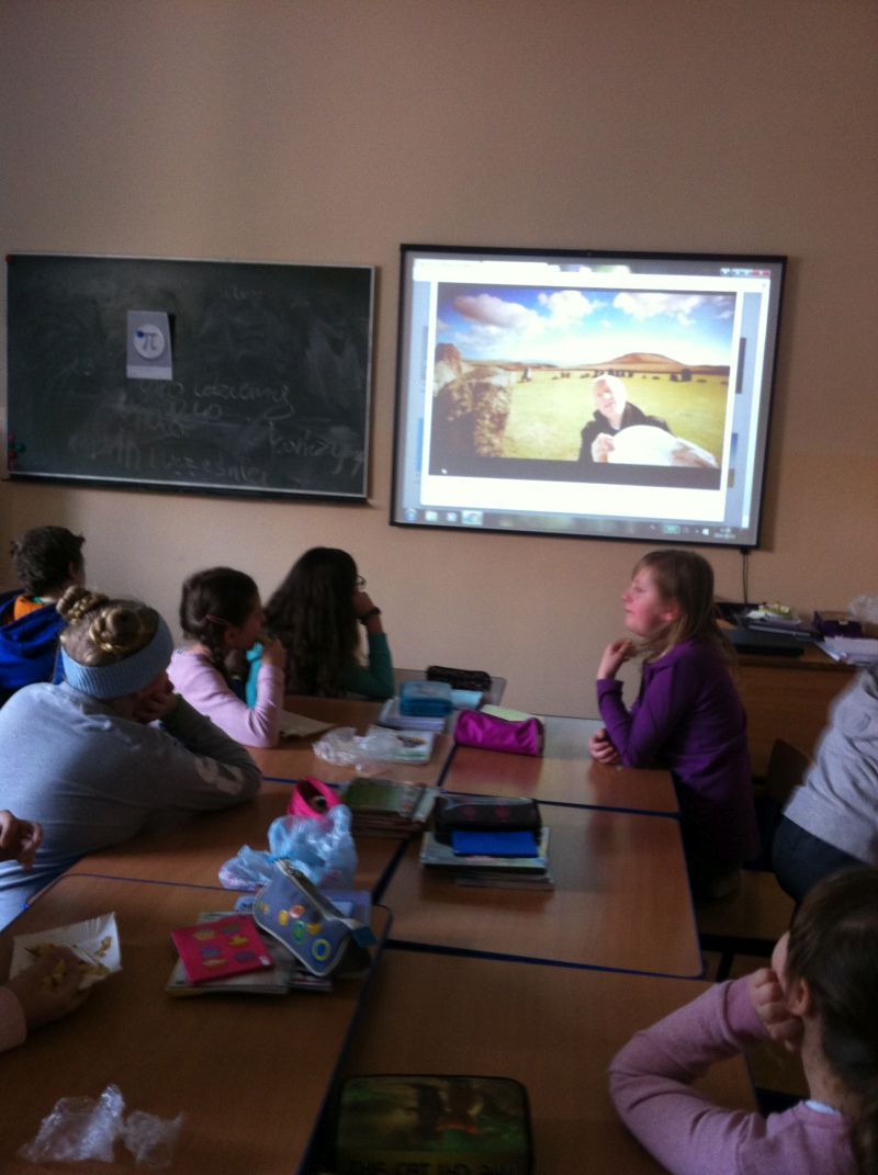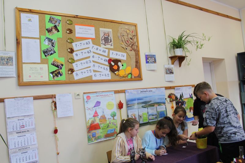 Uczniowie klas szóstych na matematyce uczestniczyli w biegu terenowym, który został zorganizowany wokół budynku szkoły. Zadaniem uczniów było m. in. narysowanie osi symetrii liścia, wymienienie przedmiotów lub sytuacji, które przypominają poznane figury lub pojęcia matematyczne. Uczniowie klas piątych i czwartej b na boisku szkolnym grali w klasy, utrwalając pojęcie siatki sześcianu. Ponadto musieli ułożyć zadanie dla swoich kolegów i rozwiązać inne.
